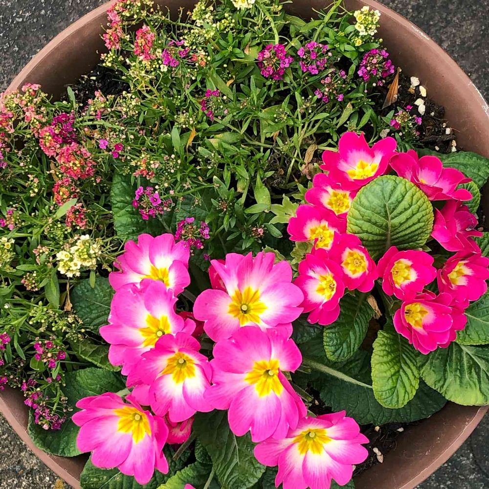 門扉前のプリムラとアリッサムの寄せ植えです🤗