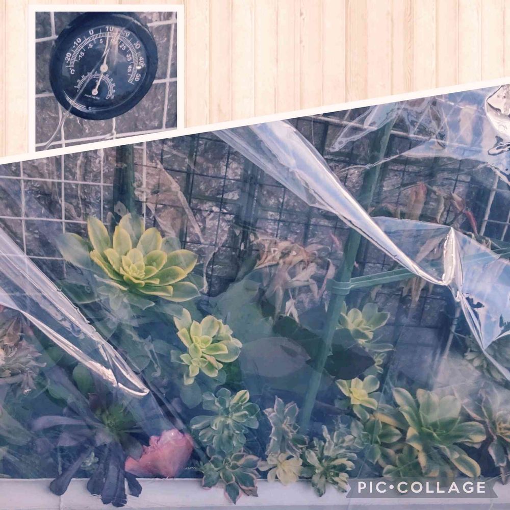 ビニール&保温シートで、夜間保温させてるけど、何度になっているか気になり、温度計購入。