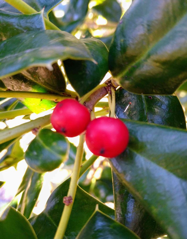 クリスマスホーリー、今年は花を見なかったので実を諦めていたら、サクランボみたいに仲良く2粒🔴🔴ありました🎶🎶