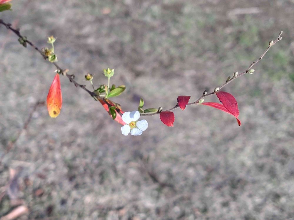 雪柳の花に真っ赤な葉っぱ❤️🤍