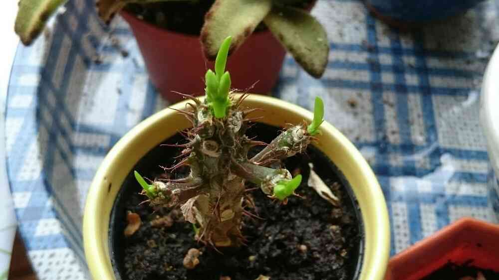 葉ダニにやられて、葉っぱがなくなってしまった花キリンさん。新しい芽が出てきたよ~♪