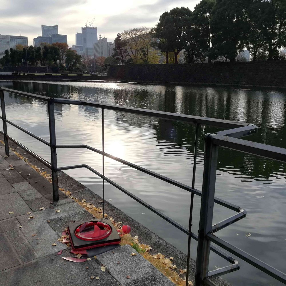 1 こなごなになった三角コーンが佇むほとり。ここは皇居のお堀。