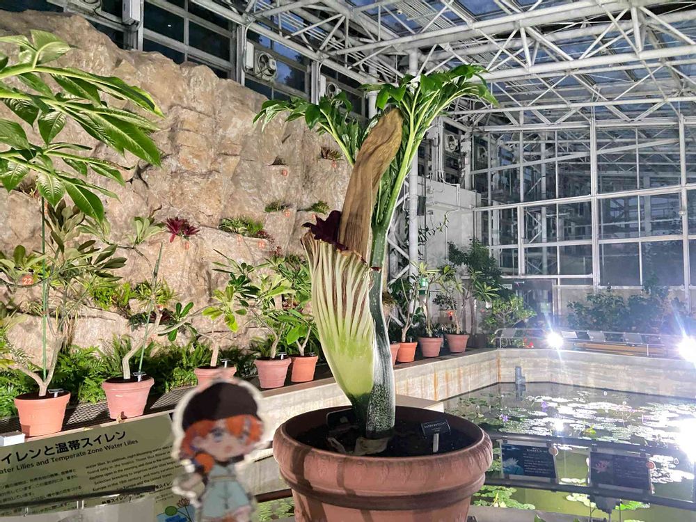 ショクダイオオコンニャクが開花したときの写真です。少しぼやけてしまいましたが収めることができました。特有の匂いは午後にかけて薄れてしまったようで、脱脂綿に匂いをつけたものが瓶詰めにされて置かれていました。