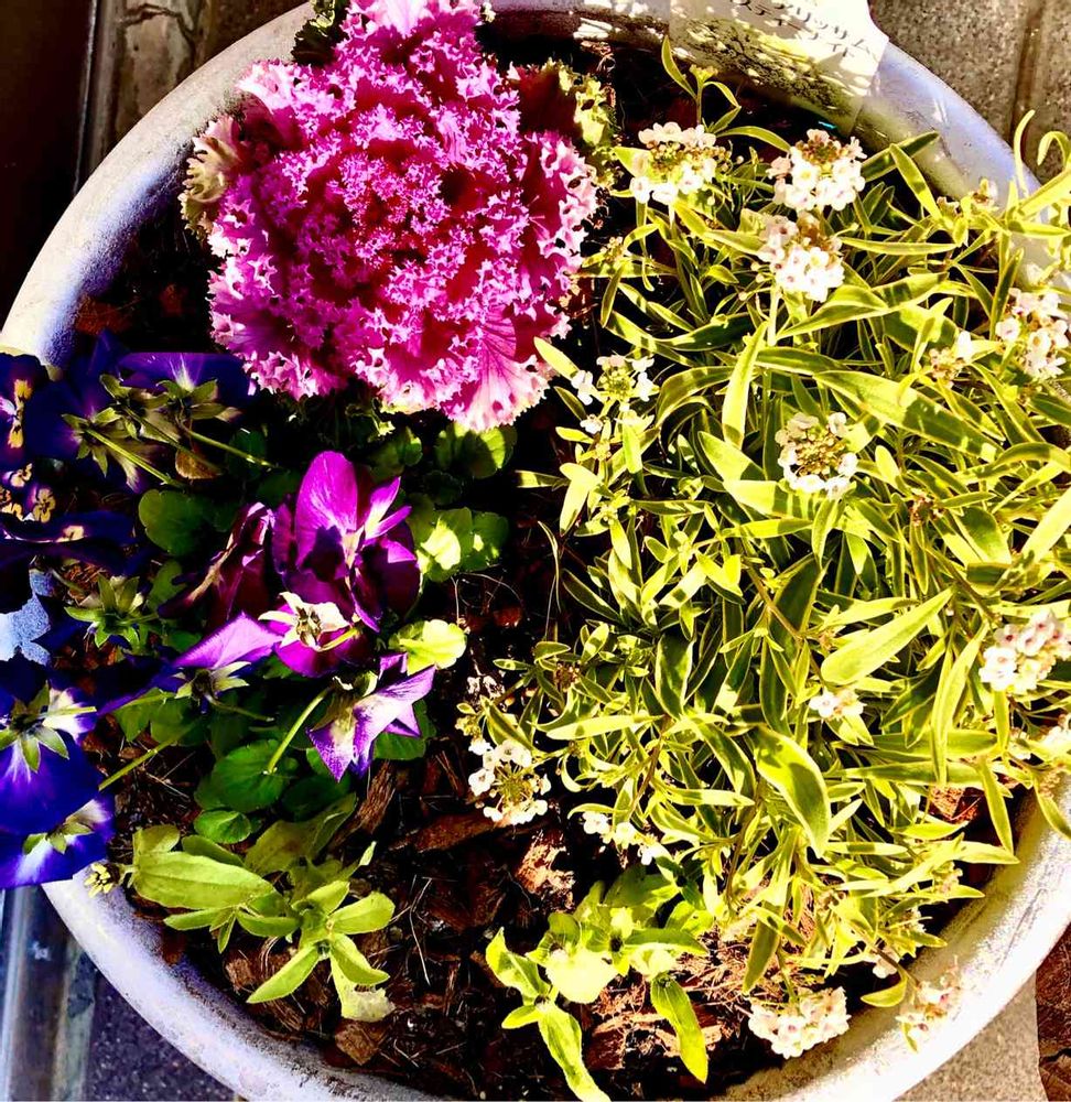 アリッサムとスミレに葉牡丹も加えて寄せ植えにしました。