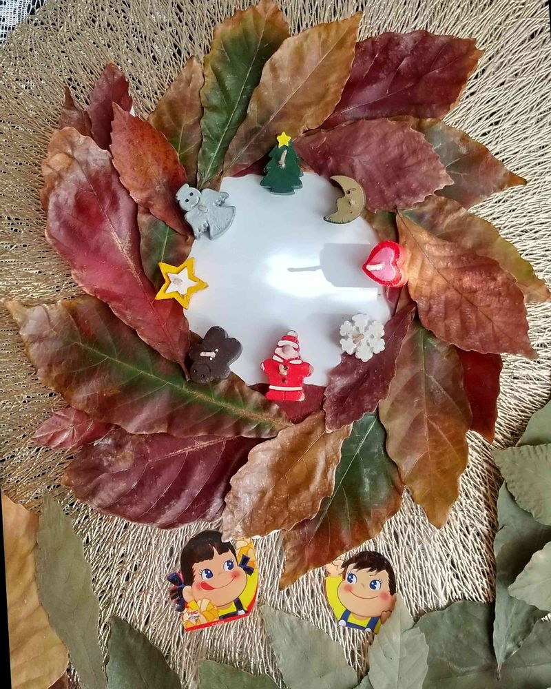 そんなコナラの葉でリースを作り、小さなキャンドル🕯️を内側に並べてみました。( *´艸)♪