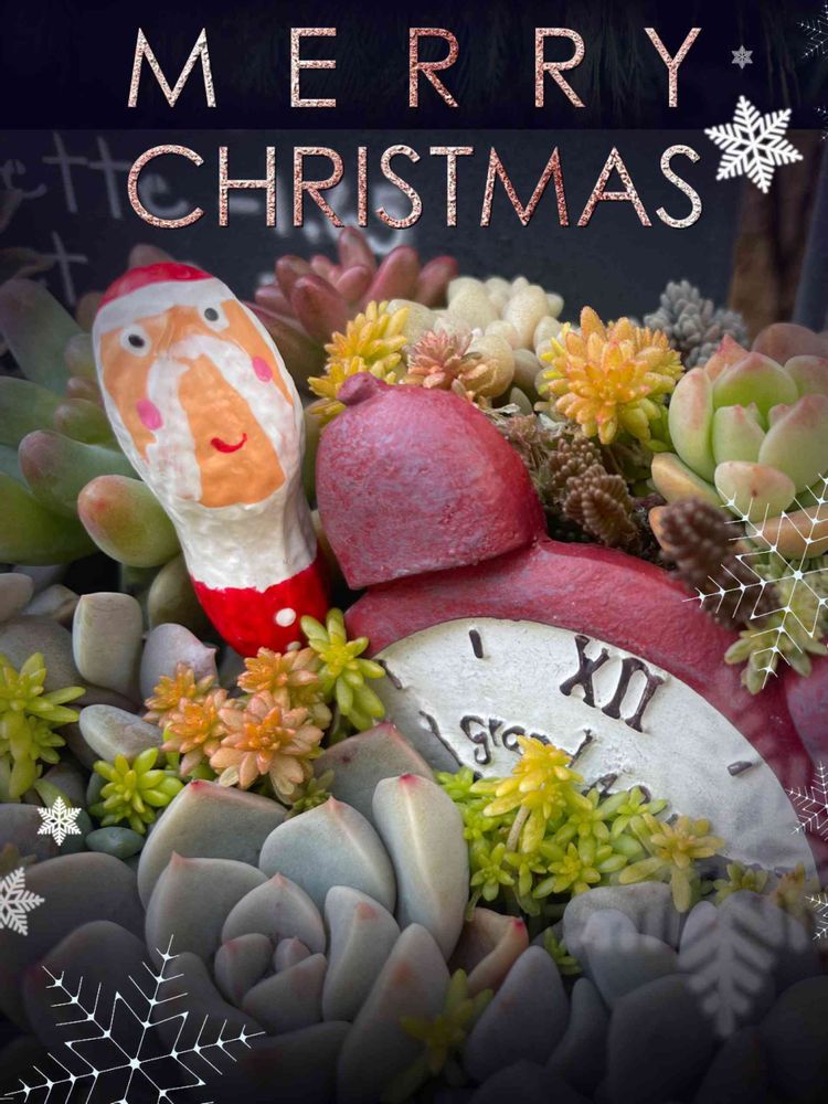 かわいい多肉ちゃんとサンタさんですね🥰ほんとかぜで棚から出っ張ってる子の葉先が傷んでました 気をつけないとですね🤗