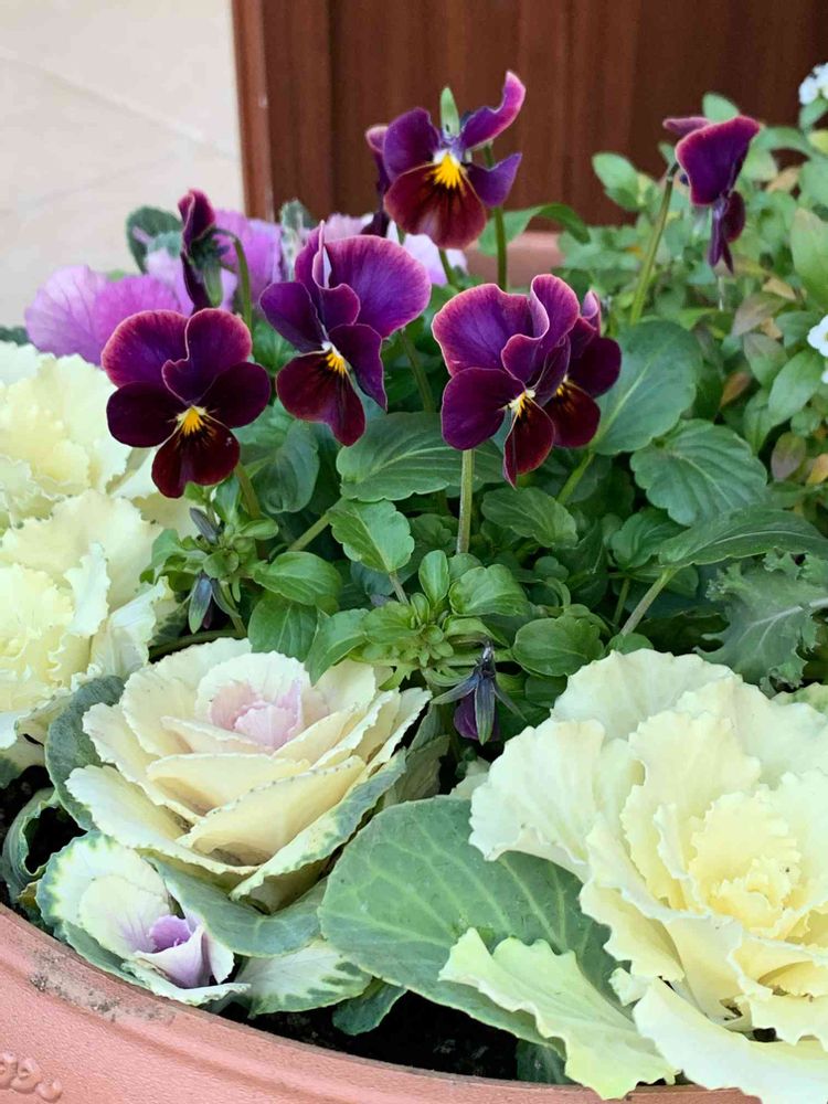 キレイな白い葉牡丹と、ステキな紫系のビオラ💕