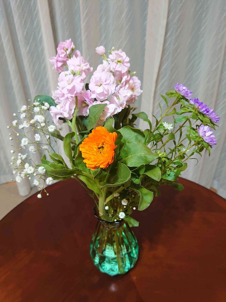 今回の仏花です。クリスマス仕様でも何でも無いけれど、最後にアラセイトウ、200円おつとめ品を足してあります。これで満足してくれるかなぁ。