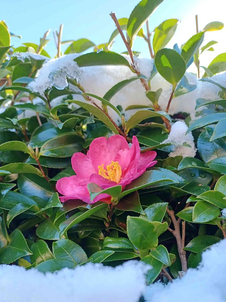真っ白な雪の間に紅い山茶花…これもお目出度く!♥🤍