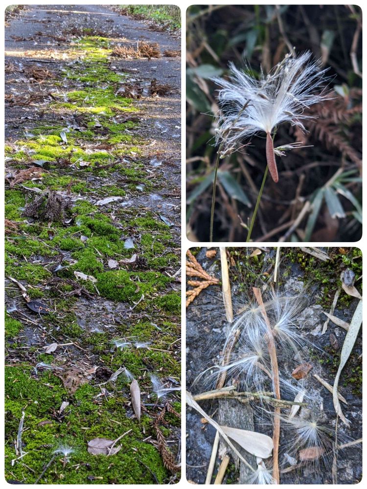 細い山道に広範囲にモフモフの種髪が落ちていたり枯れた枝に引っかかっていました。