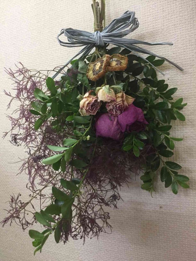 スモークツリーが手に入ったのでツゲ、バラ等でスワッグを作りました。スモークツリーがドライになる過程が楽しみです。
