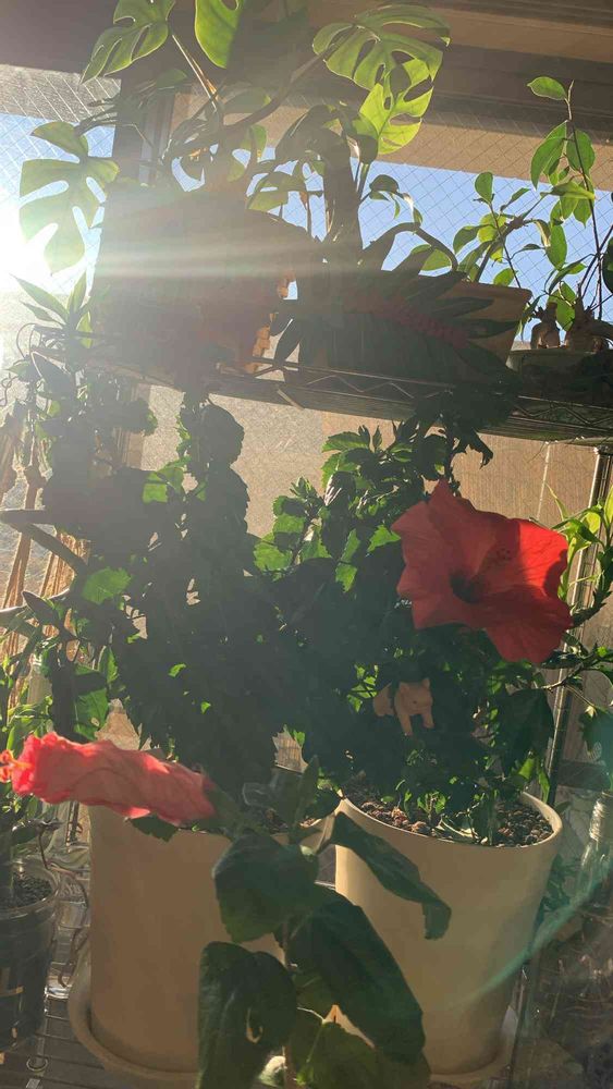 #ハイビスカス#ハイビスカスサマーブリーズ#開花#ヒメモンステラ#ガジュマル#朝日#眩しい#エアプランツ