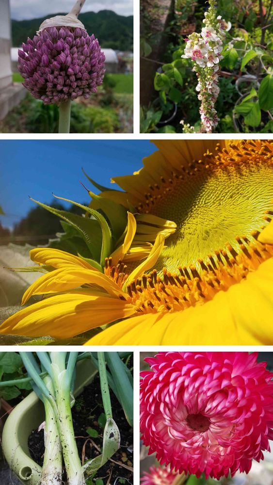 なかなかのコラージュ、ひまわり、ニンニク、視点が素敵。