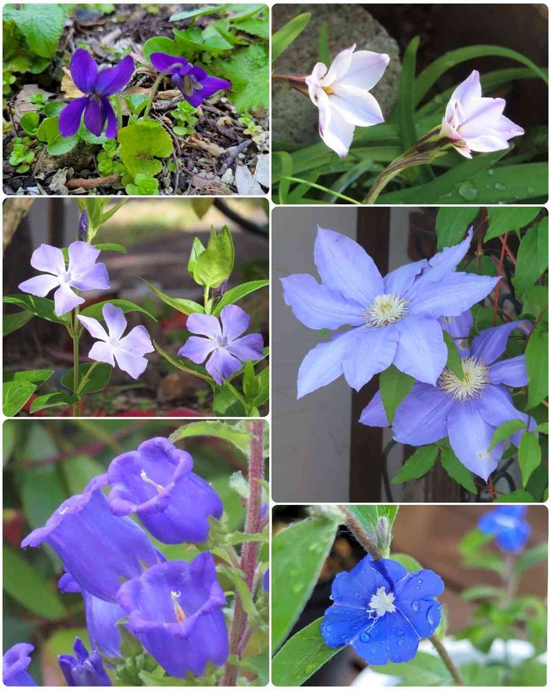 スミレ、ハナニラ、ツルニチニチソウ、クレマチス、フウリンソウ、アメリカンブルー
