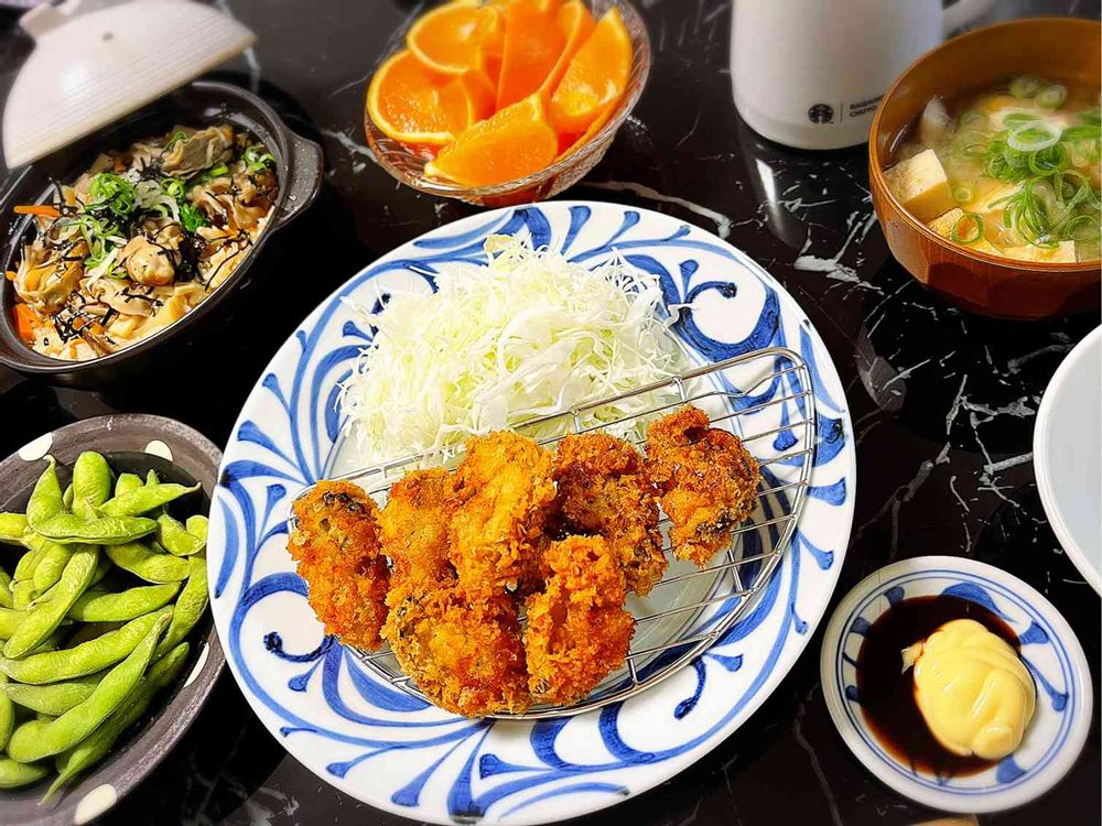 今夜はかき飯、カキフライ、紅まどんな、枝豆、厚揚げと舞茸の味噌汁にしました✨