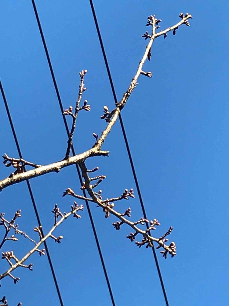 広い庭園。フェンス際の寒桜の花芽が丸くなって来ました。