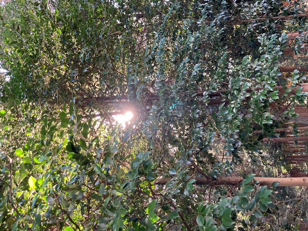 神社の木の隙間から太陽の光が 10月撮影