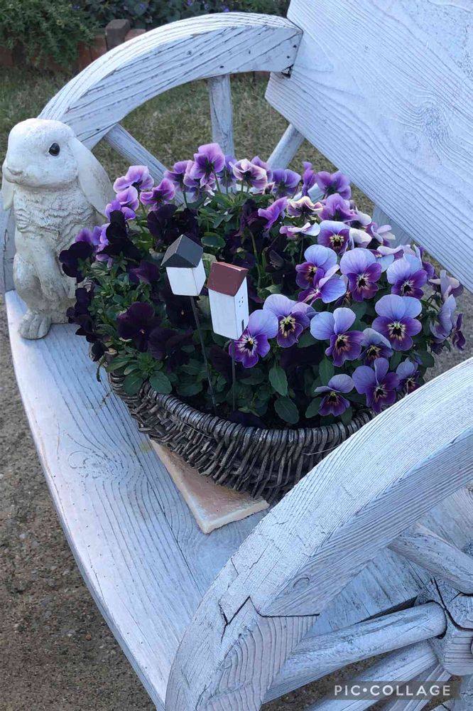 ガーデニングの参考になりそうなお宅の白いベンチに飾ってあるビオラの籠🧺