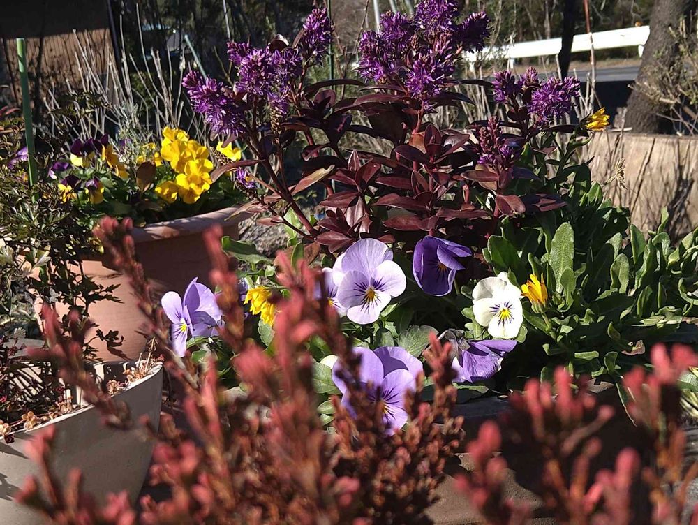 手前の紅葉したカルーナブルガリス越しに、カレンジュラ、ビオラ、シックなベロニカグレースを覗いたら…こんな感じになりました🤎❤️💜🤍🧡💜