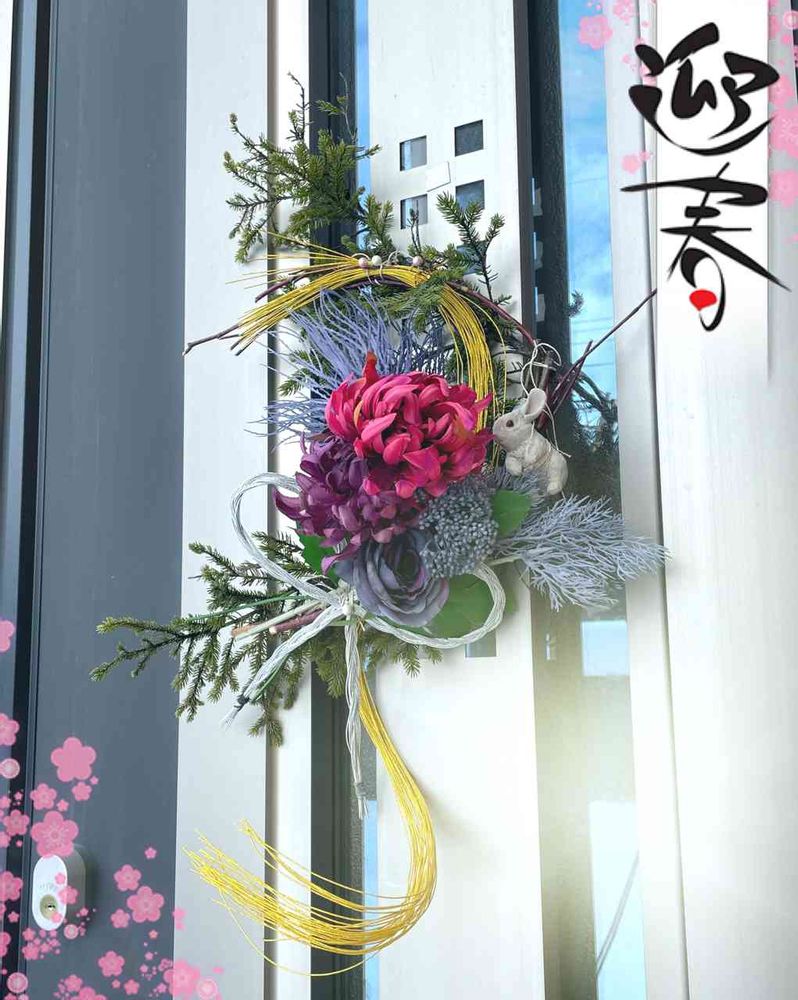 家の松の枝を切って土台にはサンゴミズキの枝 後は100均で調達した造花や水引で作りました😄