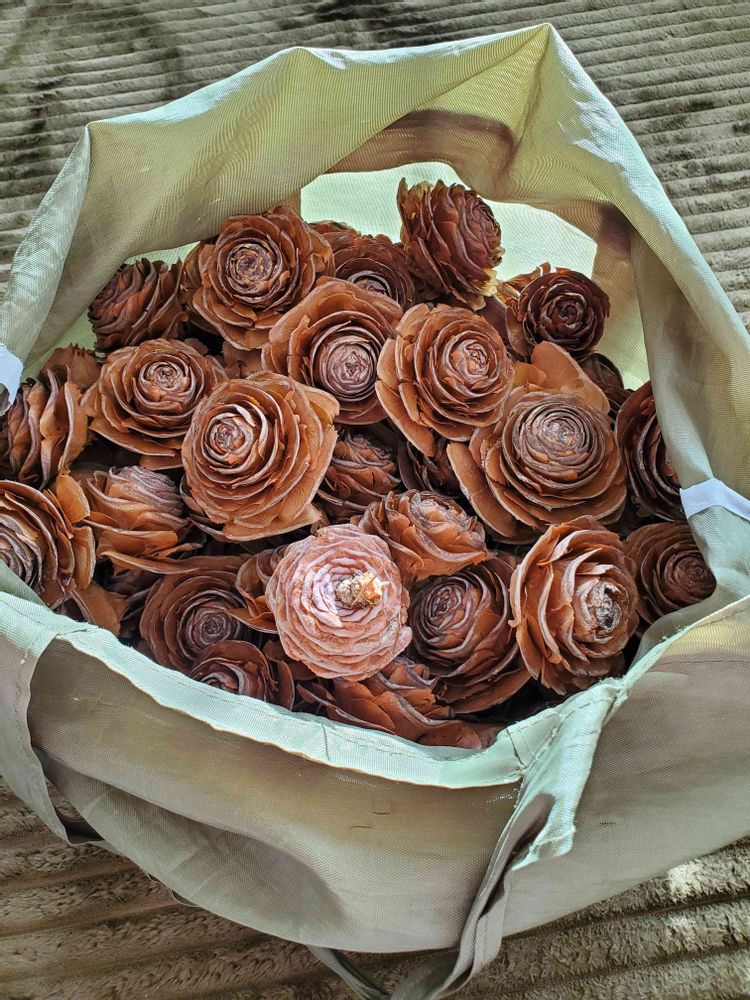 バケツにバラバラにならないようにグルーガン、ボンド等で留めたシダーローズを入れて