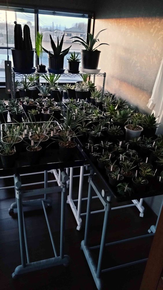いつの間にか、物干しパイプがアガベの置き台になってる😲しかも足りなくて買い足してるし、、