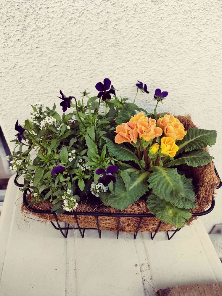イエローカラーのプリムラ・ジュリアンに、極小ビオラ、スイートアリッサムの小さな寄植え♡