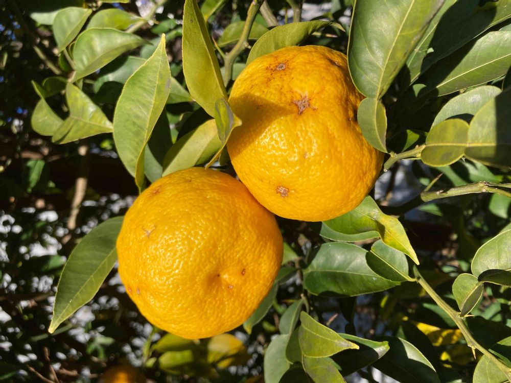 似て非なる柑橘類 ご近所さんのお庭に4本並んで実ってます。