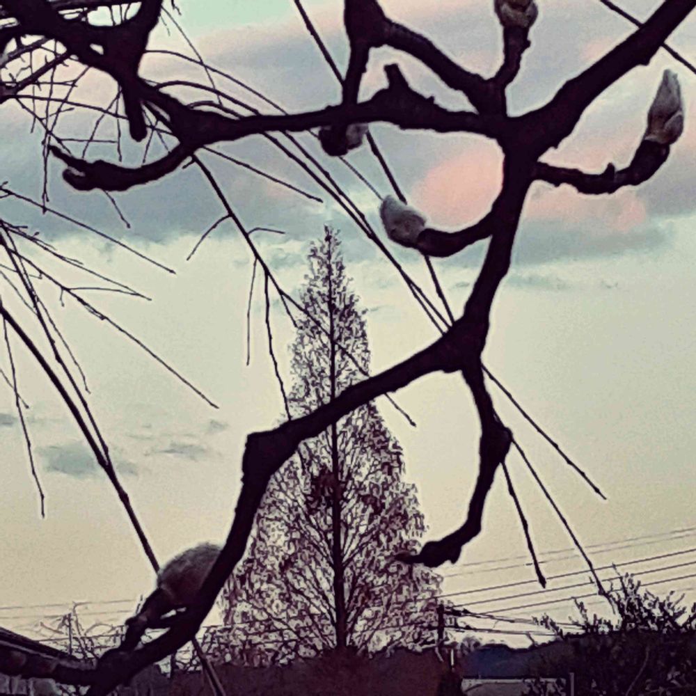 モクレンの蕾を撮るつもりで📱を向けたら、後ろの高い🌲がいい雰囲気だったので😆