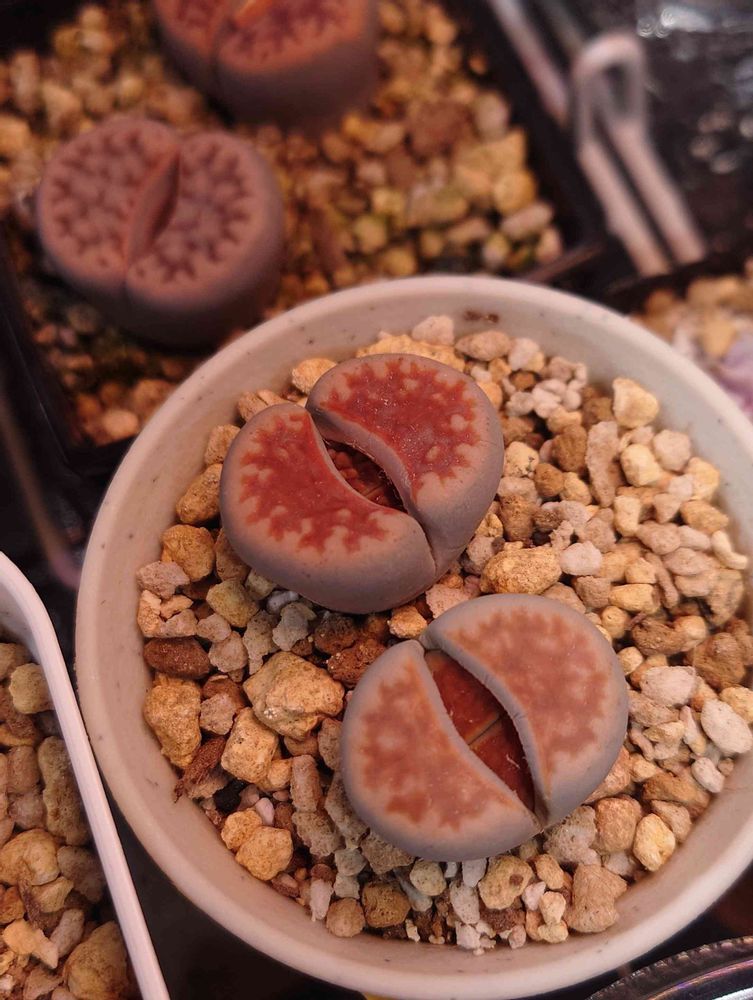 合着部が割れ、中から新芽が見え始めてきたリトープス。18株あるうちの11株に脱皮の兆候が見られてきました🙌