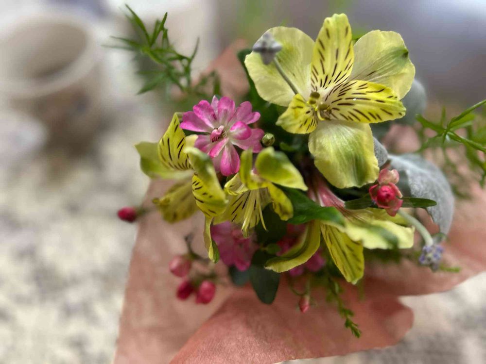 アストロメリア以外は我が家のお花と緑で🌿小さなアレンジにしました💐