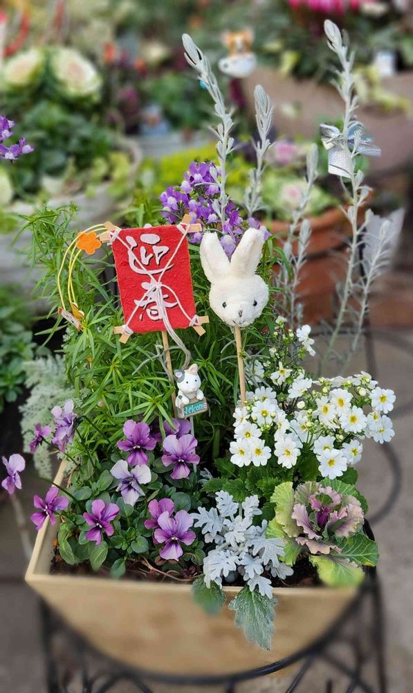 クリスマスの時は角を正面にしてビオラが前だったけどお正月verは正面を変えてみました🐰🪁