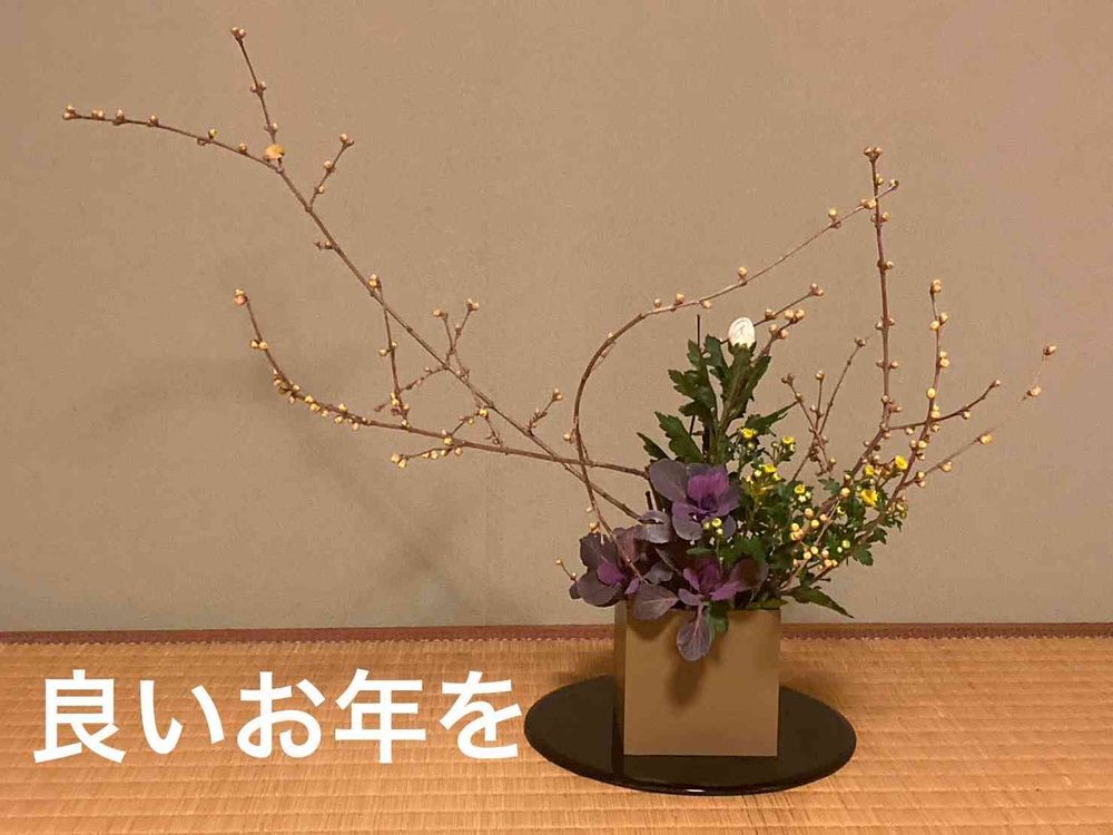 写真なのでそう見えるのかもしれませんが、ロウバイの枝の線は出来るだけ、交差しないように生けると、なおいい作品になります。