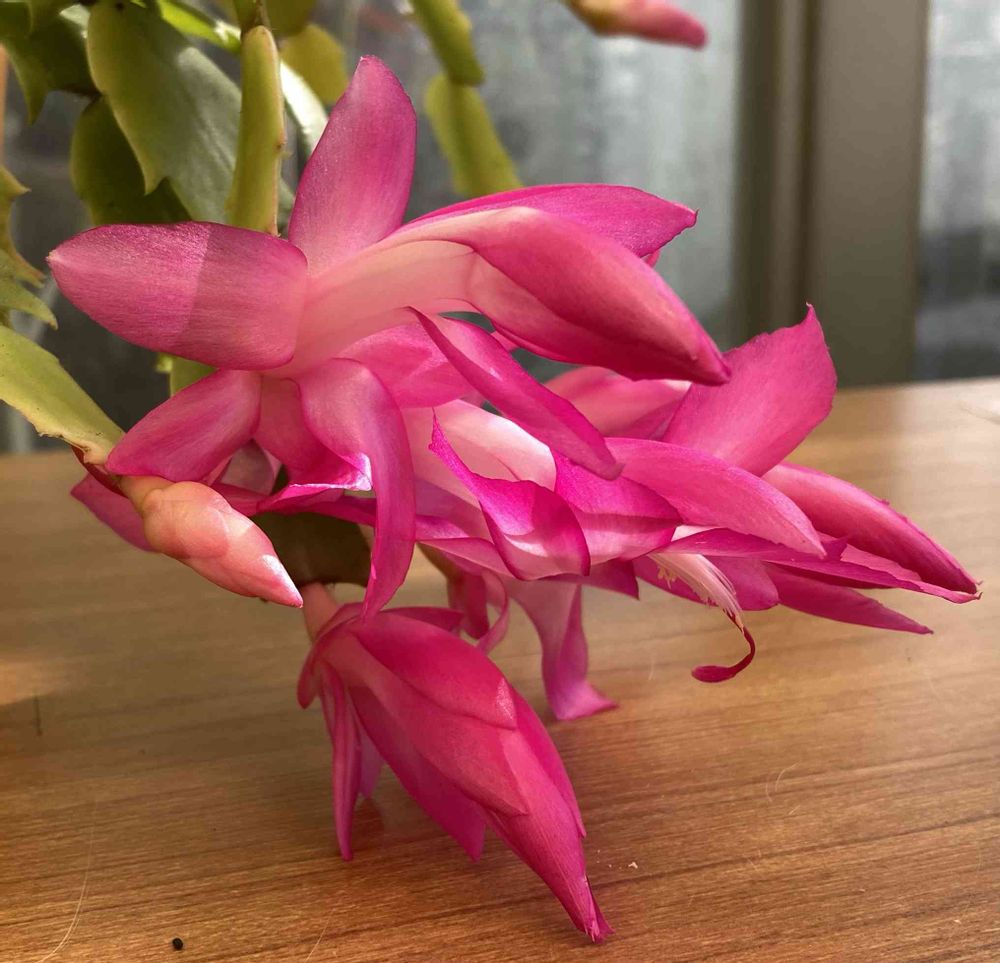 鉢の外側に垂れ下がったシャコバサボテンさんが、台の上に乗っかってくつろいでいました😅