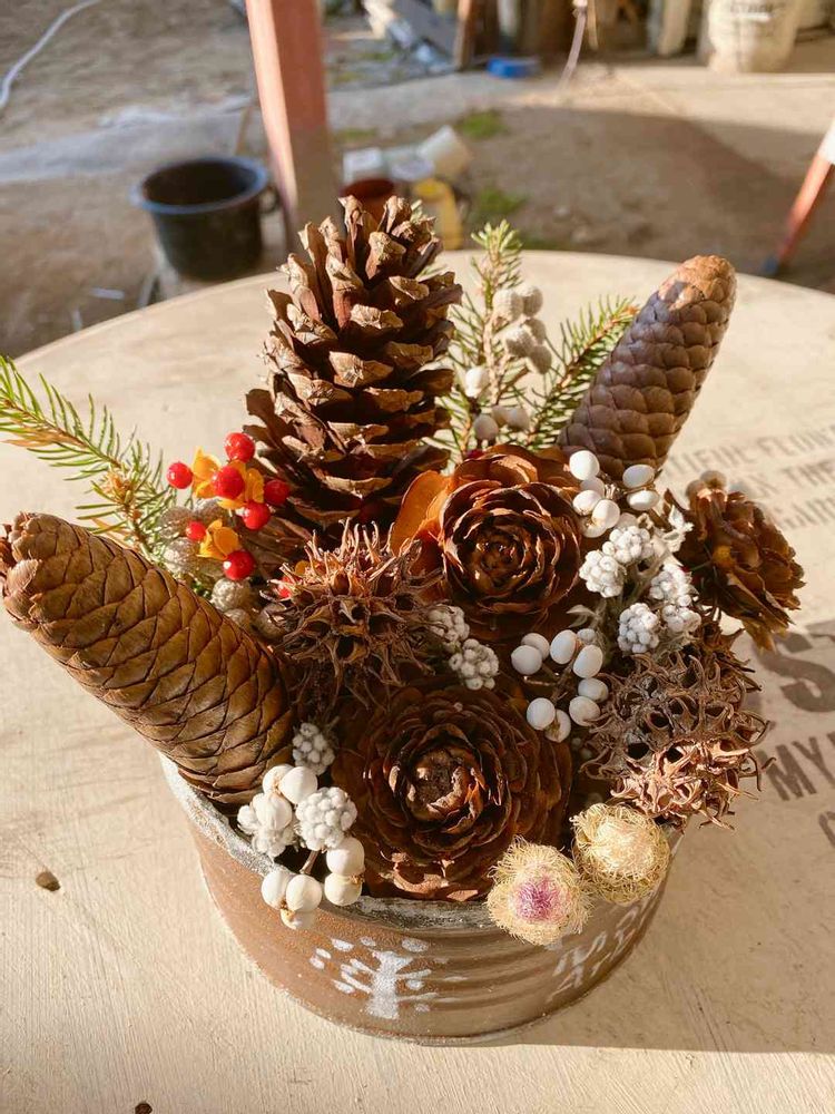 主人と拾いまくった木の実をリメ缶にブッ刺しました😆
