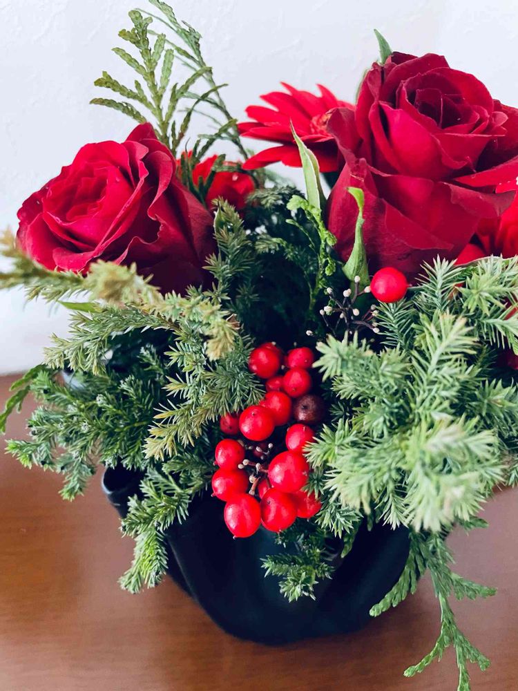 赤いアレンジメント、テーブルに置いての食事好評でした😊