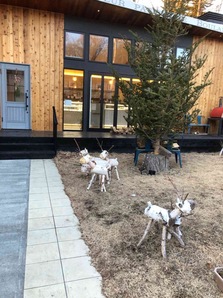 鹿ファミリーを配した冬の庭作りとスタイリッシュな店内が素敵な軽井沢のテイクアウト専門店に伺いました🌲