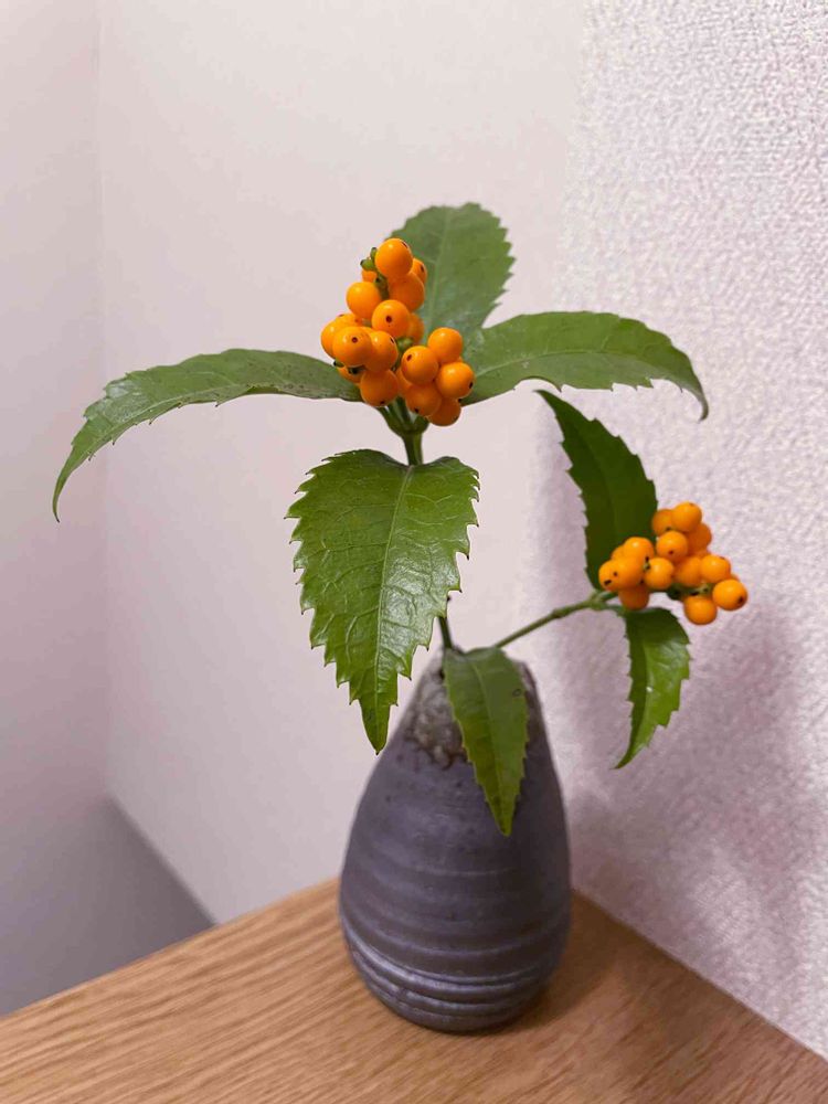 お正月に相応しい、センリョウが、形の良い、花瓶に飾られて、綺麗です。