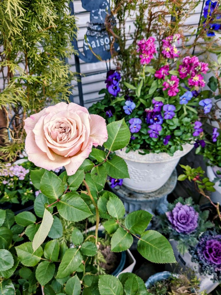 綺麗なバラと後ろのストックのピンクと、ビオラや下の葉牡丹の紫とのカラーコーディネートが素敵です🌹💗💜