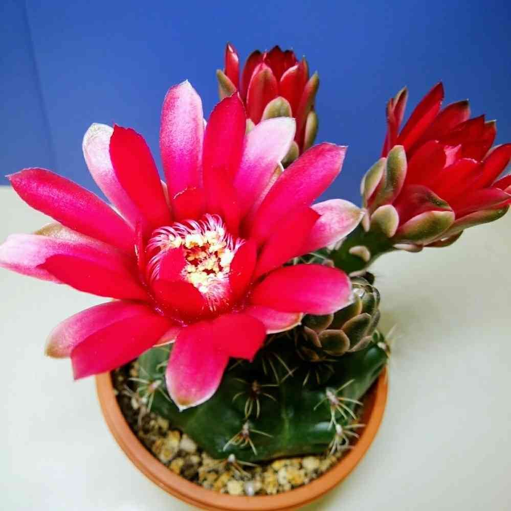 今日、開花するだろうと職場に連れてきたサボテン、ギムノカリキウム属:緋花玉です