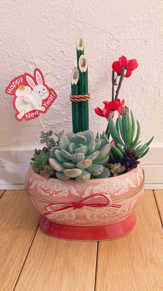 お正月用の寄せ植えイベントあったので、自分と子供で選んで寄せ植えした物です。