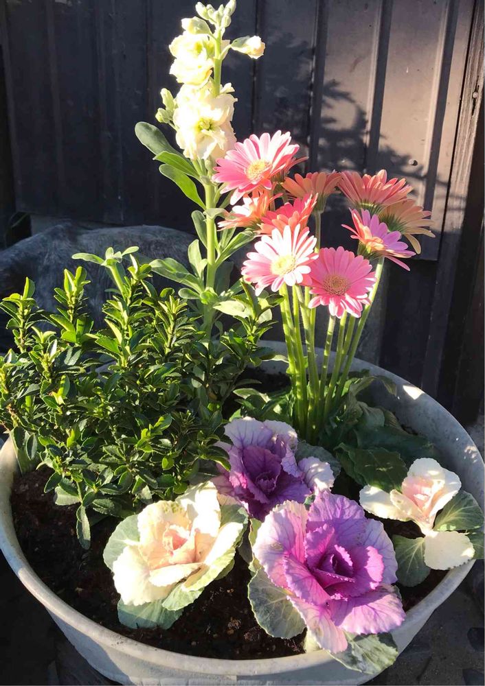 小さな葉牡丹と、ガーベラで、寄植えを、昨年の暮に作りました。