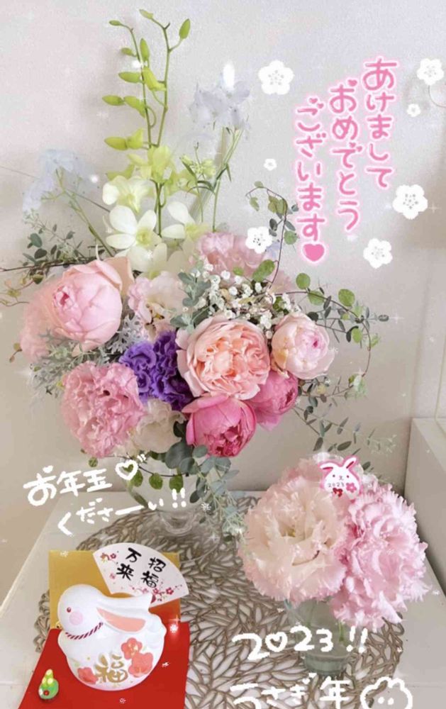庭に咲いてるシャリファアスマ、アンブリッジローズ、ボスコベルを使ってお正月アレンジ作りました🎍🌿💐🐇💕✨