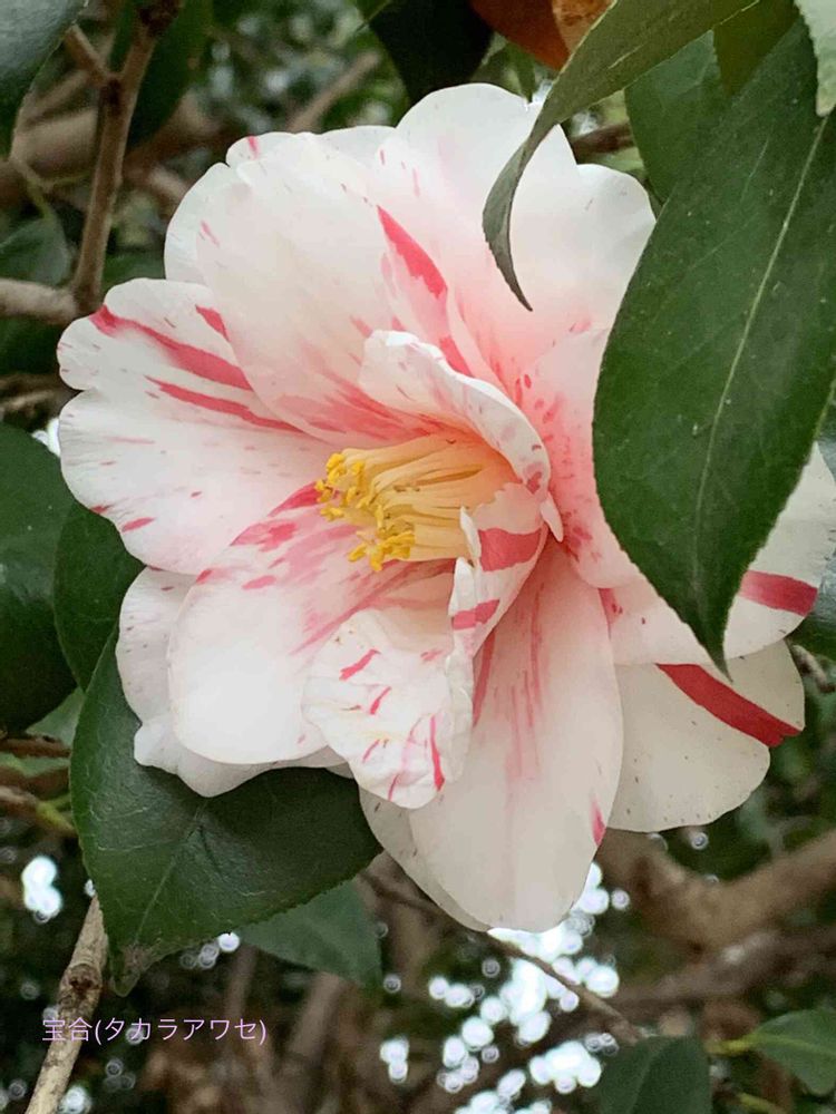 宝合(タカラあわせ)…白地に縦の紅の絞りが入る椿です