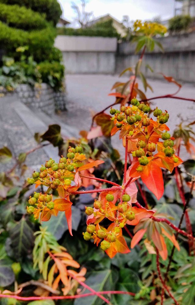 一枚目〜フランス料理屋さんの前の花壇に〜鮮やかな朱色に紅葉した植物🔶が〜