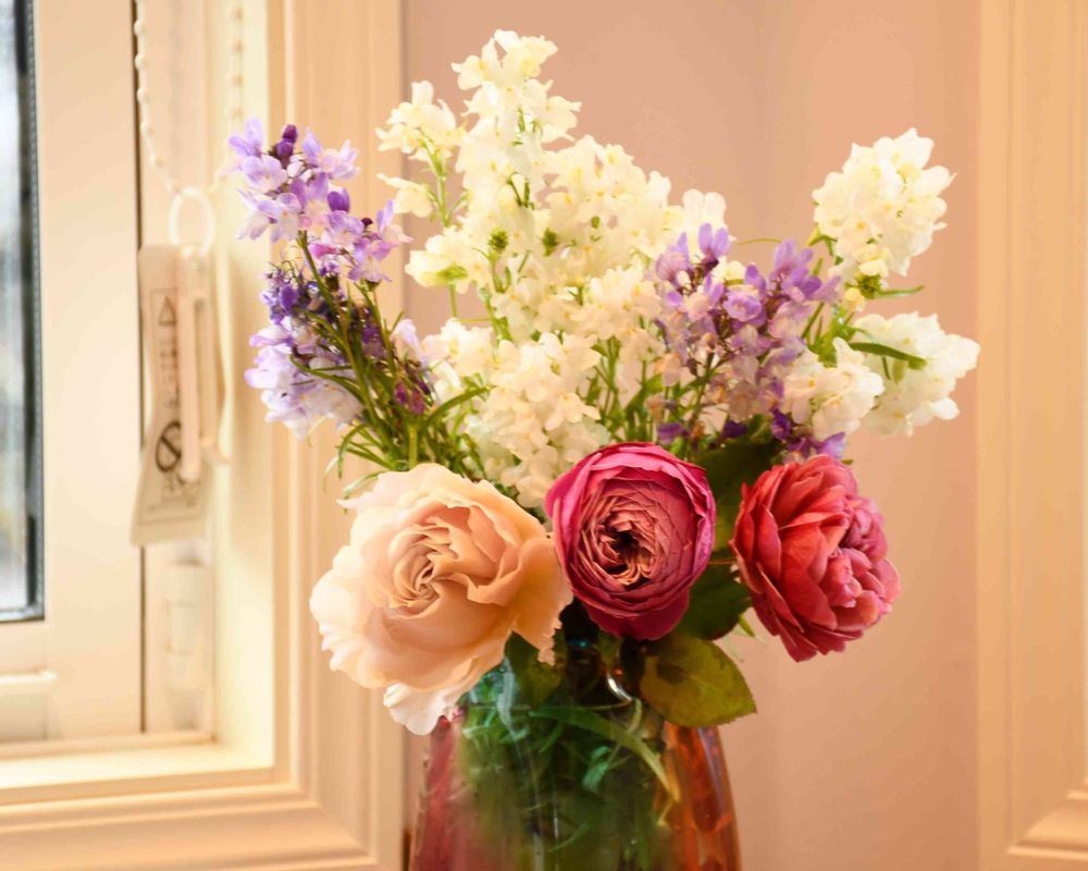 バラとリナリアが素敵な切花になっていますね💕綺麗です💕