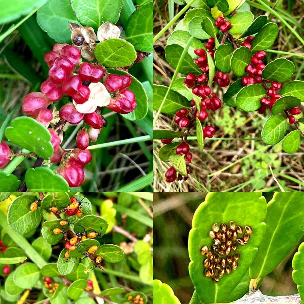 フタスジハリカメムシの寄生植物、食草となっているハリツルマサキ。孵化したら実に群がって吸汁する虫らしいですね。