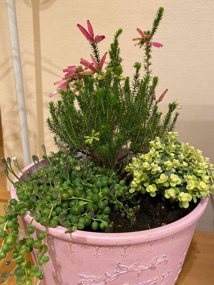 寄せ植えにはまってしまい、グリーンネックレスとヘリクリサムライムミニをいつでも使えるように、手元で育てたくて、苗を買ってきました。庭植えの適期がくるまでの間、エリカちゃんと一緒の鉢で楽しませてね。隙間たっぷりなので、少しでも生長して欲しい〜