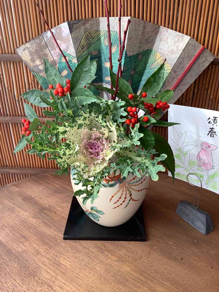 赤い実ものと葉牡丹があれば もうお正月ですね🎍 後ろの扇のデザインは現代的なものですね✨ モダンで良いですね😊