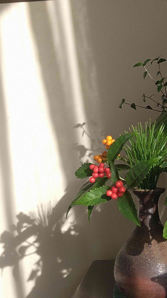 赤実黄実の万両に松のお目出度いお花の影が嬉しいですね!